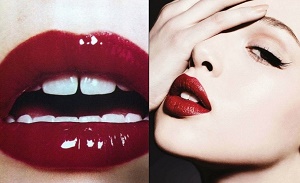 Такой макияж является чувственным. Кроме того - подчеркивает белизну зубов. Техника проста - поверх помады винного цвета нужно нанести блеск для губ. Но сначала - тональное средство на губы, припудрить губы, по контуру нанести карандаш - растушевать, далее - помада, блеск.